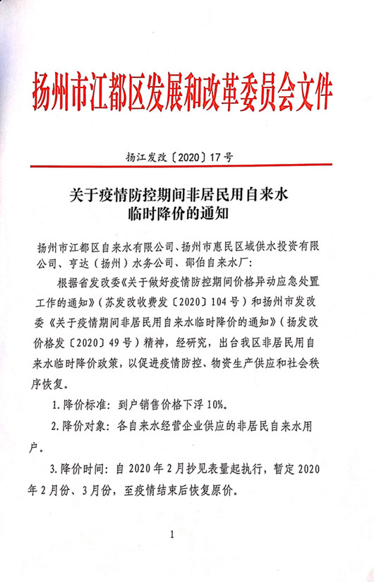 關(guān)于疫情防控期間非居民用自來水臨時(shí)降價(jià)的通知